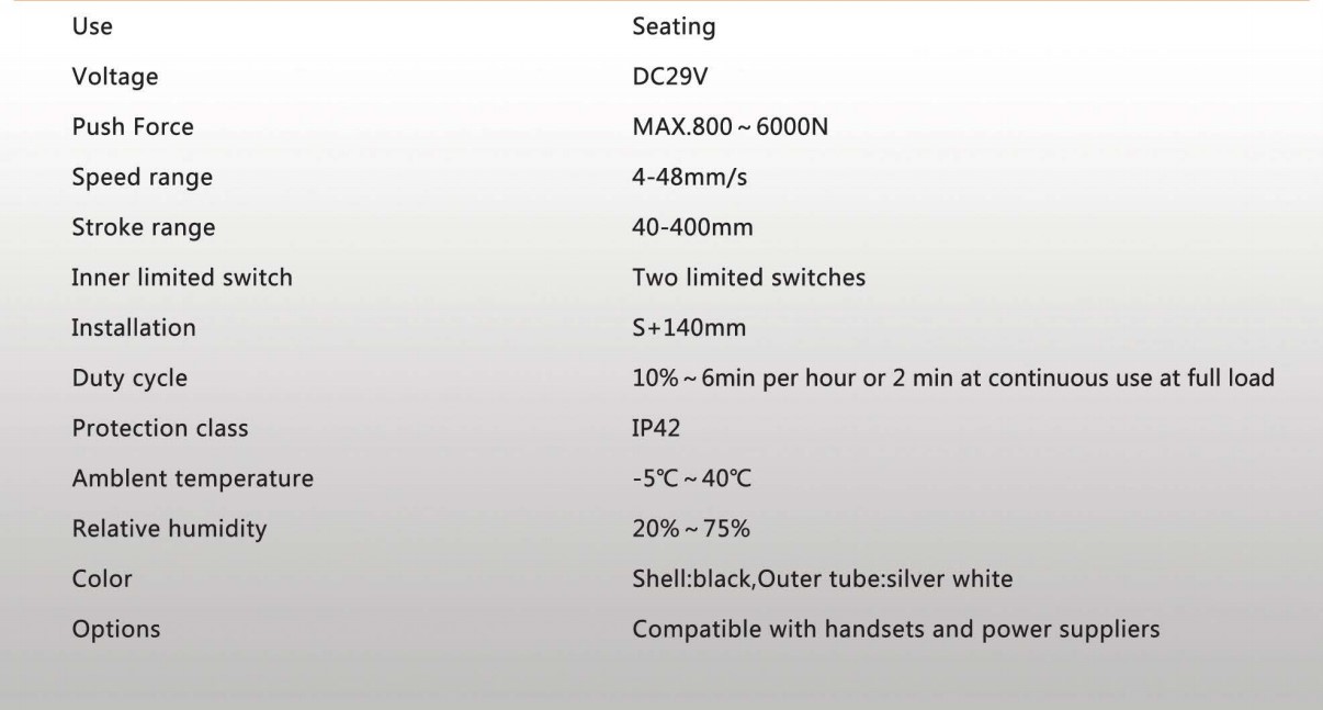 本產(chǎn)品已通過(guò)CE、UL、PSE、ISO9001認(rèn)證,它有一個(gè)新穎的外觀和制作精良,噪音小,操作簡(jiǎn)單,讓它成為暢銷國(guó)內(nèi)外,被廣泛用于電動(dòng)沙發(fā)、醫(yī)療床、手術(shù)床,按摩椅等。