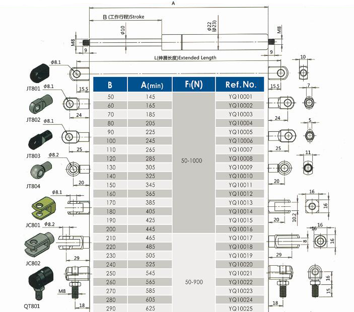 注:由于氣彈簧是非標(biāo)準(zhǔn)的,以上僅為型號(hào)的一部分。我們可以根據(jù)客戶的要求定制。